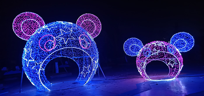 龍君根據(jù)客戶要求,結(jié)合景區(qū)游玩主題,搭配使用了米奇頭燈光拱門(mén)、藍(lán)白相間的天幕造型、海洋天幕以及海馬燈光造型,與海洋主題和兒童樂(lè)園主題相呼應(yīng),使景區(qū)的夜晚增添了一份特別的美。整套燈光造型以海洋藍(lán)為主色調(diào),熠熠的藍(lán)光使景區(qū)更加明亮。